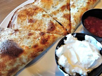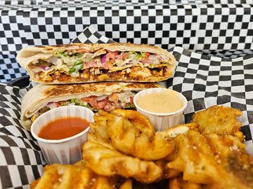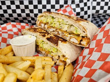 Fried chicken, tangy buffalo sauce, house sauce, lettuce, tomato, and onion. Served with fries. Can be made into a Crunchadilla.