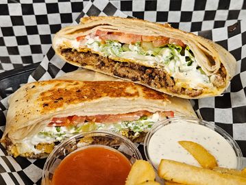 Ground beef, nacho cheese, lettuce, tomato, onion, sour cream, tostada, wrapped in a grilled tortilla. (think Crunchwrap... but better!)