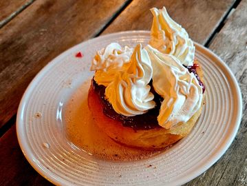 Tossed in cinnamon sugar, raspberry drizzle, and whipped cream.