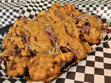 Waffle fries topped with shredded corned beef and sauerkraut, with a mix of tangy honey mustard and yellow bbq sauce.